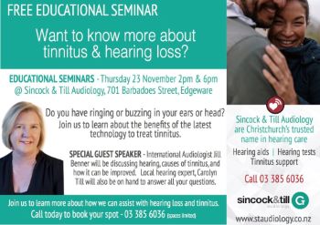 Do you have ringing or buzzing in your ears?If so you may be one of the 15% of people who experience Tinnitus. Sincock & Audiology are running free tinnitus seminars on the 23rd of November. Ring now to book your seat!