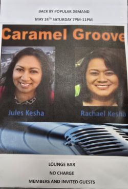 Very excited to announce CARAMEL GROOVE are back in the house this Saturday 24th, in the Lounge Bar, bring your friends and dancing shoes for a great night, we look forward to seeing you all, courtesy coach is available from 4pm please give our driver a call ON 4346163 ext 4LUCKY NUMBER: tonight $ 2600.00 be in to win, all financial members are in the draw.