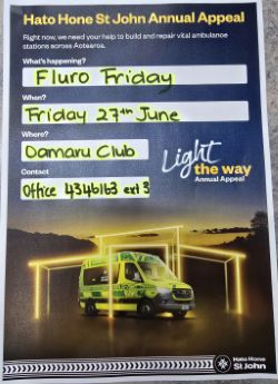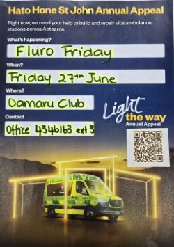PROUD TO BE PARTICIPATING IN FLURO FRIDAY, COME ON OAMARU let's get behind St John Oamaru and build them a much-needed Station. All money raised here will stay in Oamaru for our station new build. We will at some stage need these fantastic people, whether it be for ourselves, family, friends or neighbours, so come down to the Club, 27th June and enjoy the fundraising festivities.* Wear your Fluro work tops & pants etc