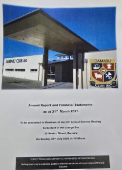 AGM: The Oamaru Club Inc, Annual General Meeting will be held on Sunday 27th July @ 10.00am in the lounge bar. (Hall is being used for a private function).