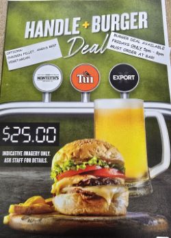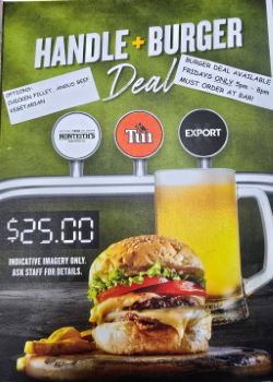 FRIDAY: NEW PROMO starts this week, Burger and Handle Deal for $ 25.00, order at the bar, this deal is FRIDAY'S ONLY (this includes non-alcoholic beverages) T & C's applies. So, get your family, workmates or group of friends together for a delicious Burger deal.