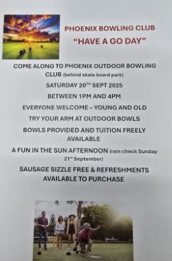 PHOENIX BOWLING CLUB: Have a go day Saturday September 20th @ 1pm at Phoenix Bowling Club, sausage sizzle, come along and try your hand at bowls, a very relaxing and fun sport and make new friends.